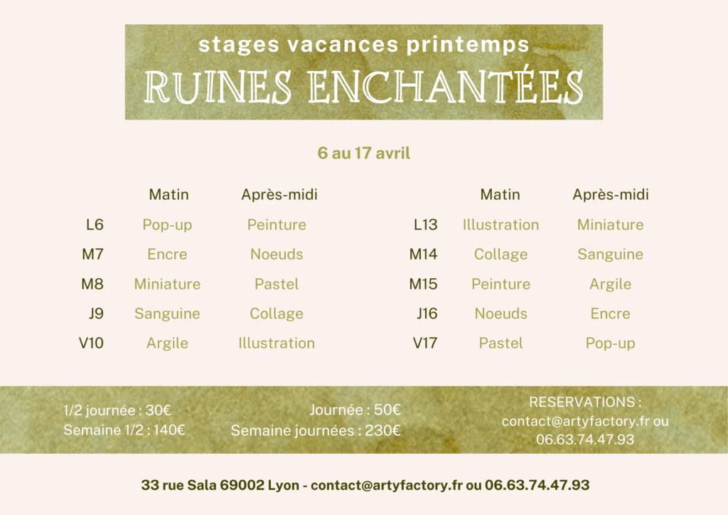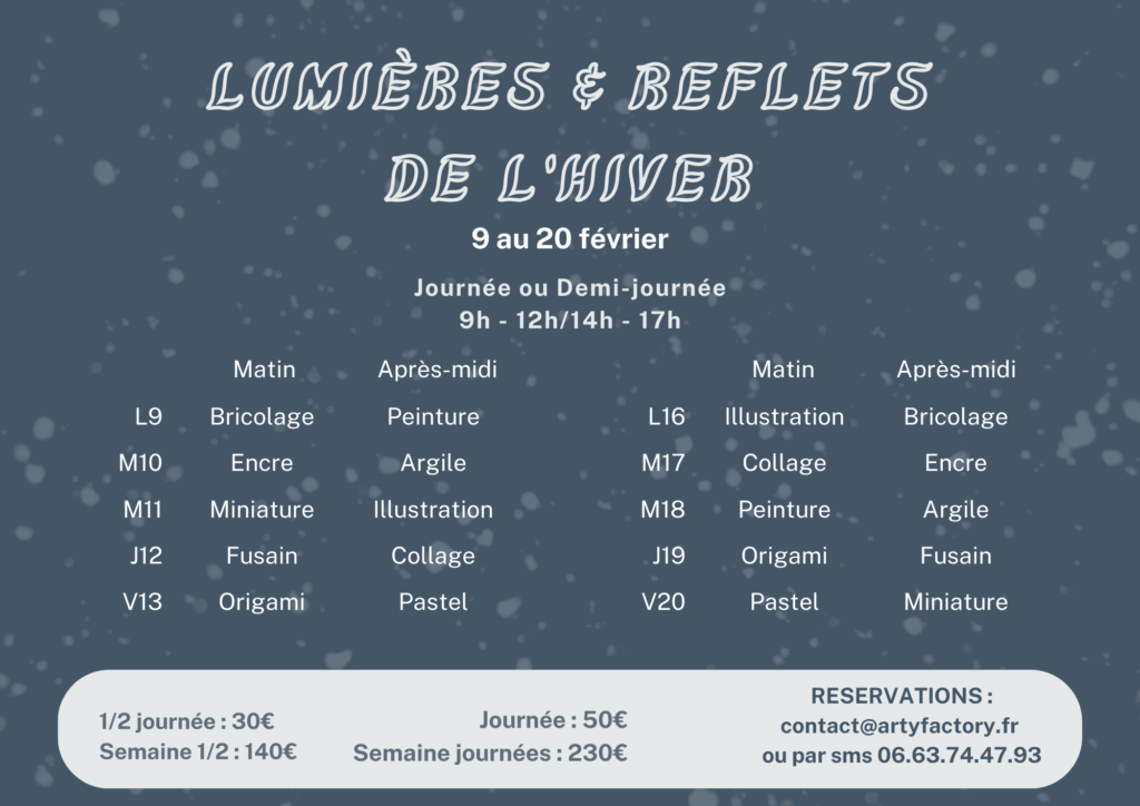 Tout au long de l’année, Arty Factory propose des ateliers thématiques, des cours réguliers, des stages pendant les vacances, pour toutes et tous : enfants/ados/adultes, débutant ou expert, curieux ou obligés… pour libérer sa créativité, partager, progresser, se faire plaisir…et repartir avec une réalisation, un souvenir.